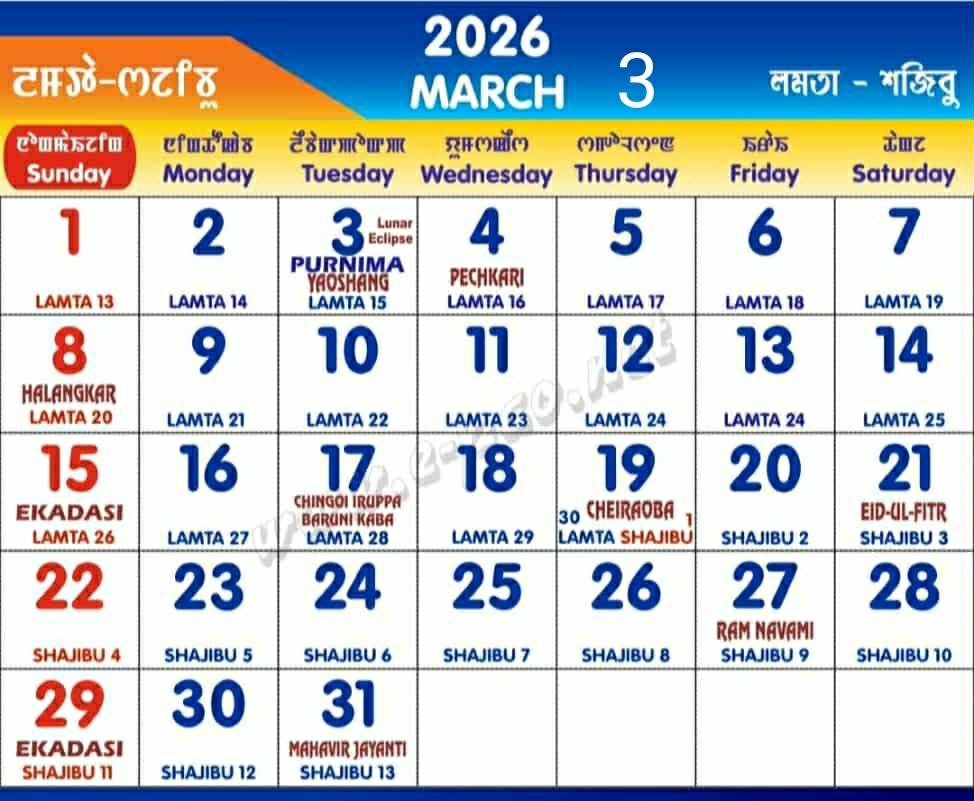 ... মথক্কী খরসিনা তাক্লিবদি মণিপুরদা লৈরিবা গৌড়া লাইনীং চৎপা অমদি মীতৈ/মৈতৈ লাইনীং চৎপা কাঙলুপ অনীমক্লা চৎনরিবা কেলেন্ডার অসি গ্রেগ্রোরিয়ান কেলেন্ডার অমদি থা'গী খোঙচৎকা মরী লৈননা শেম্বা লুনার কেলেন্ডার, শজিবু, কালেন... ফাইরেল, লমতানি। কেলেন্ডার অনীসি চৎনরি হায়বসিমদি তশেং তশেংলে, কক্লুবা য়াদ্রে। অদুনা কাঙলুপ অনী অসিনা য়ানরিবা চৎনরিবা লুনার কেলেন্ডার, থাবালোন অসিগী অহানবা থা শজিবুগী অহানবা নুমিৎ নোংমা পানববু কাঙলুপ অনী অসিগী চহী হৌবা নুমিৎনি হায়না লৌফম থোক্লিবনি। লাইনীংদি চৎনীংবা চৎপা য়াই। অদুবু চহী হৌবদি হৌনীংবা নুমিৎ, তাং অমদা হেক্তা হৌবা য়াবা নত্তে। মালেম'সিদা কনানসু য়ারোই, কনানসু তৌনদে।