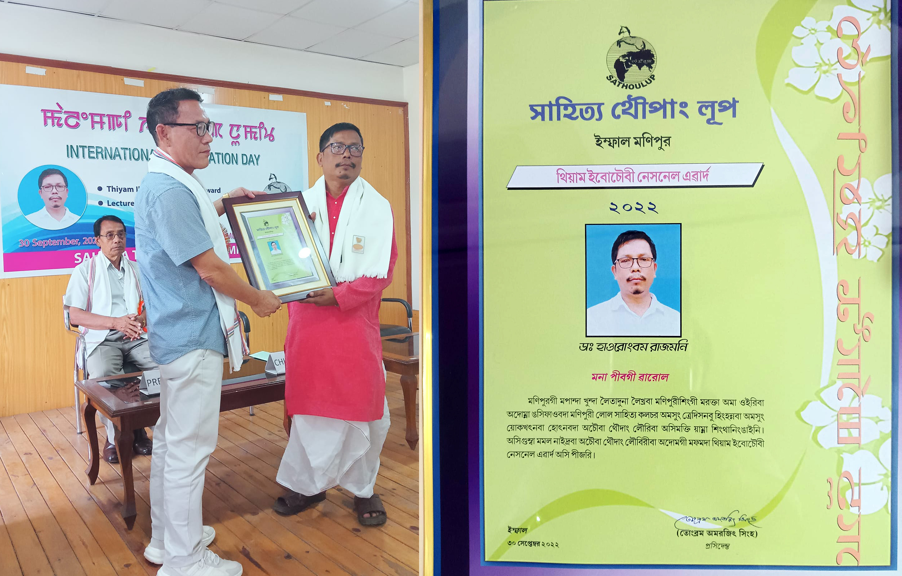 ইম্ফাল, সেপ্টেম্বর ৩০ : সাহিত্য থৌপাং লূপ, ইম্ফাল (মণিপুর) না শীন্দুনা ঙসি ওল্ড এসেমব্লি রোদকী মণিপুর লেজিসলেটিভ এসেমব্লিগী ম্যুজিয়াম অমসুং অর্কাইবসকী হোলদা ‘মালেমগী হন্দোকপা নুমিৎ’ (ইন্টারনেসনেল ত্রান্সলেসন দে) পাঙথোকখিবগা লোয়ননা আসামগী কাছারদগী অইবা ডা. হাওরোংবম রাজমনিদা থিয়াম ইবেচৌবী নেসনেল এৱার্দ লান্থোকখ্রে।
